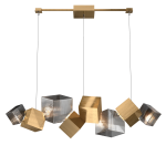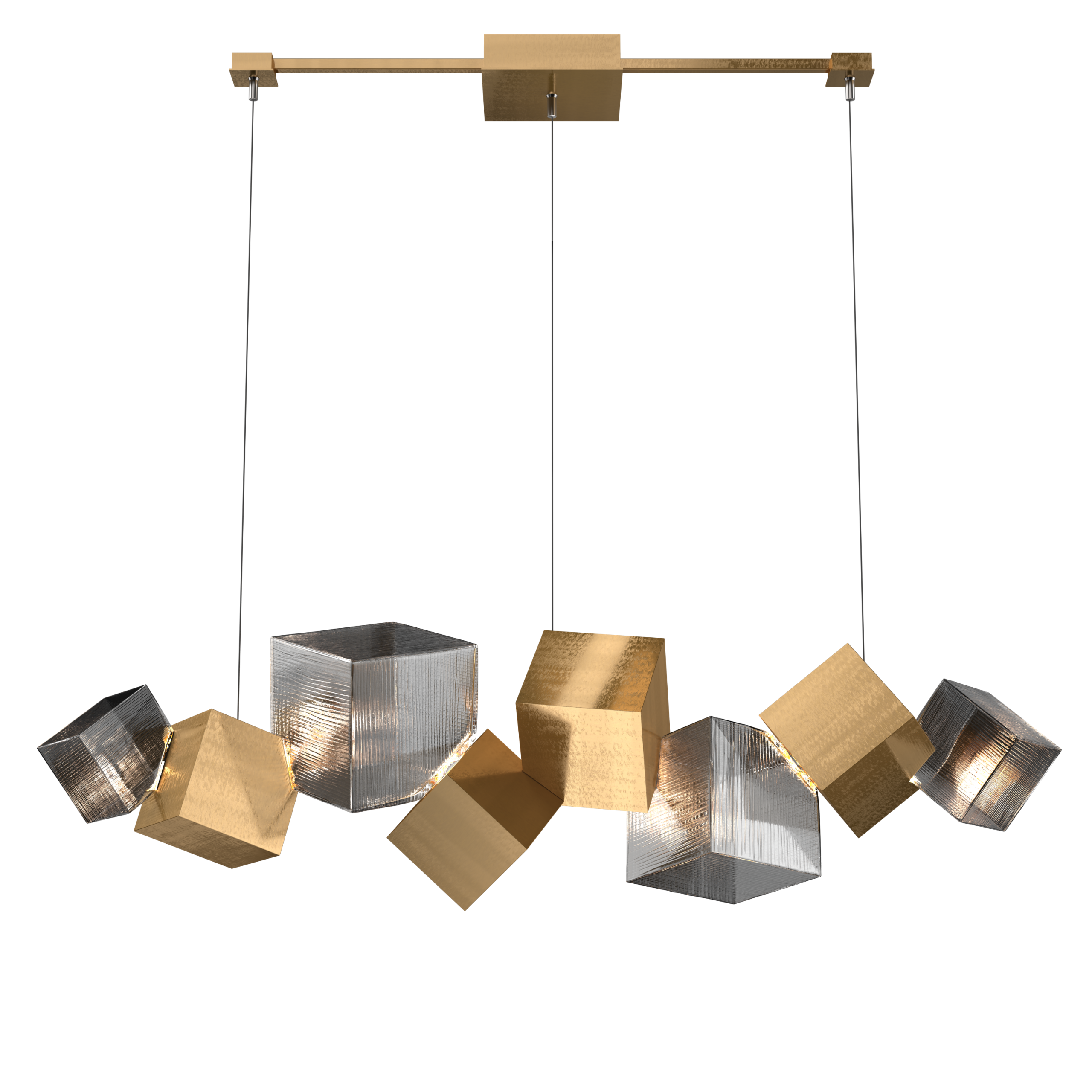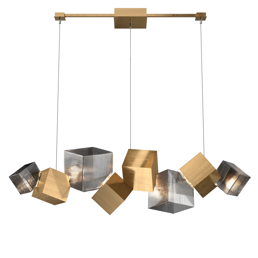 A geometric lighting sculpture in hand-distressed steel and textured blown glass. Includes adjustable cable suspension and 3,000K integrated LED.